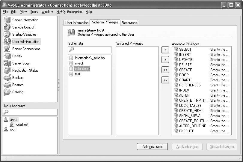 Управление привилегиями в MySQL Administrator