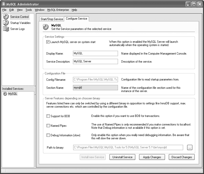 4. Если сервер MySQL не был сконфигурирован как сервис Windows, то кнопка Start Service (Запустить сервис), расположенная в правой области окна, недоступна. Необходимо выполнить следующие предварительные действия:
