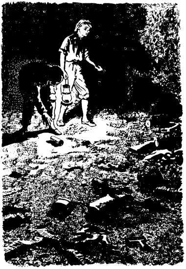 Мальчики взялись за дело. Степа подбирал все подряд, а Пашка с разбором. Он брал гильзы от снарядов, котелки, ложки — всё из цветных металлов. И действительно, довольно скоро они сложили в сквозном зале две большие кучи лома, повыше своего роста. Напоследок Пашка обмакнул кисть в смолу, обошел вокруг кучек и сделал пометки на гильзах, котелках и других, по его мнению, наиболее ценных вещах. С собой Пашка взял только ствол винтовки без затвора и приклада, а Степа захватил автомат с разорванным дулом и маленькую солдатскую лопатку. С этой добычей ребята и встретили тетю Машу у входа в шахту. Отдав ей бидоны, они вернулись в галерею, откуда начинался спуск в нижний ярус. Чтобы не таскать с собой тяжестей, «оружие» и лопату сложили возле стены у входа.
