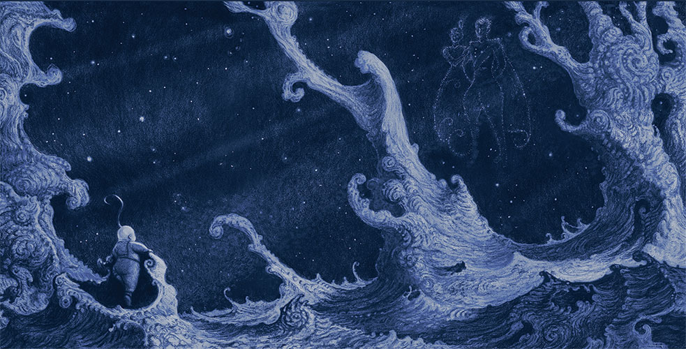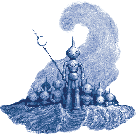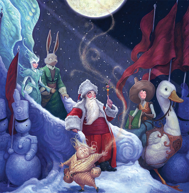 Малыш понял, что детям не нужно многого. Порой игрушка, конфета, маленький сюрприз, сладкий сон или хорошая сказка способны сделать их счастливыми. И тогда Малыш стал смотреть в телескоп на Землю. Он заглянул в самые потаённые её уголки — даже на верхушки гор, всегда скрытые за облаками. Он нашёл мастера, который бы делал детям игрушки, кролика, который бы приносил пасхальные яйца, Фею из королевства Пунджам Хи Лу, которая бы оставляла подарки под подушками. Малышу даже удалось разыскать на далёком заброшенном острове человечка, знающего всё о хороших снах. И наконец, Малыш послал детям Земли чудесную даму, чтобы рассказывала им сказки.