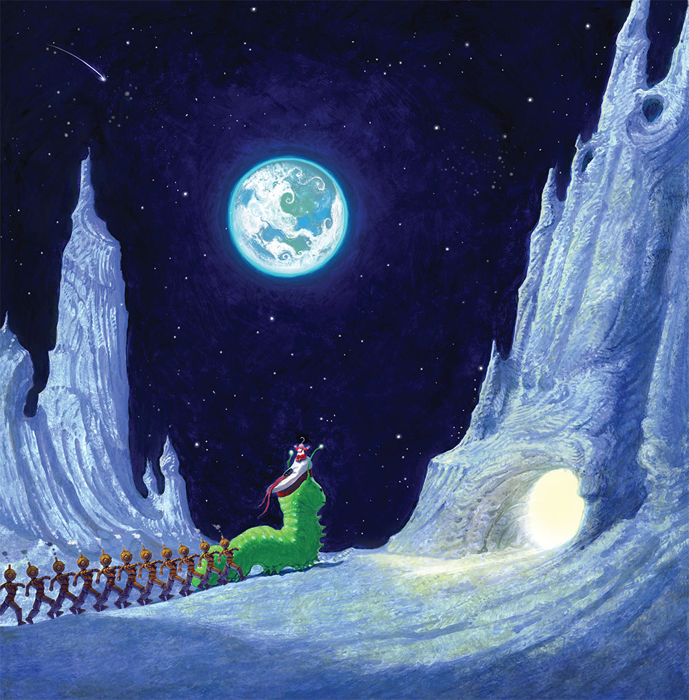 Лунороботы, лунные мышки и гигантские светящиеся гусеницы окружили Малыша. Единственными словами, которые знал Малыш, были «ту-ту», поэтому он всё повторял и повторял их. Одна из гусениц аккуратно подняла его и повезла на своей спине к убежищу — туннелю, который прорезал лунные скалы. Малыш задрал голову и грустно посмотрел на мерцающее вдалеке созвездие своих родителей. Вот теперь он действительно стал Лунным Малышом — он оказался один-одинёшенек на всей Луне.