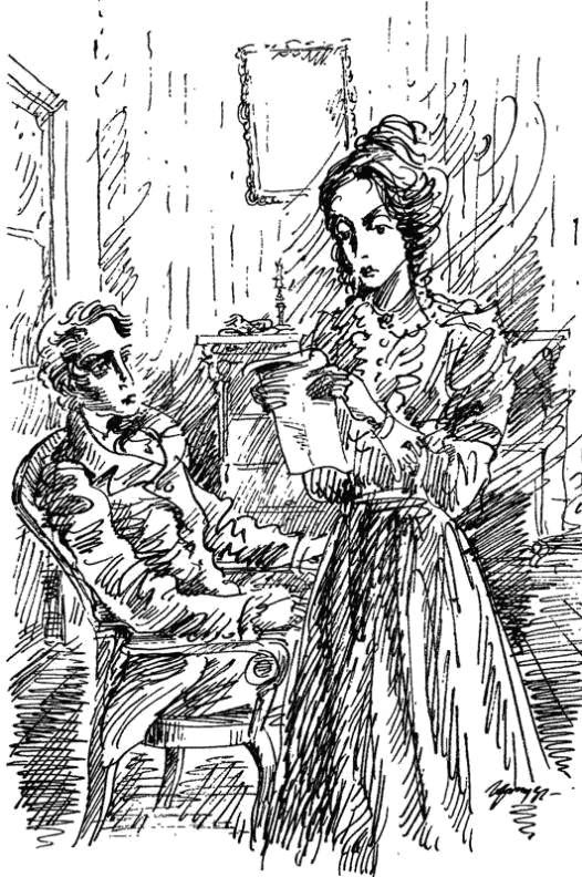 Строчку за строчкой, слово за словом, она читала, между тем как мрачное настроение постепенно овладело ею и страшная бледность распространилась по лицу. Дойдя до конца третьей страницы, она опустила руку с письмом и медленно повернула голову к мужу. В таком положении стояла она, без слез в глазах, без движения в лице, не говоря ни слова, не трогаясь с места, — стояла, сжав холодными пальцами роковое письмо и глядя с затаенным дыханием на своего слепого мужа.