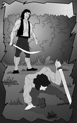 С молодого бойца слетела вся его ленивая расслабленность. Он понял, что сейчас, на этом уединенном пустыре, защищаться придется всерьез, и теперь рубился в полную силу. Тальвар скрестился со спатой не на жизнь, а на смерть.