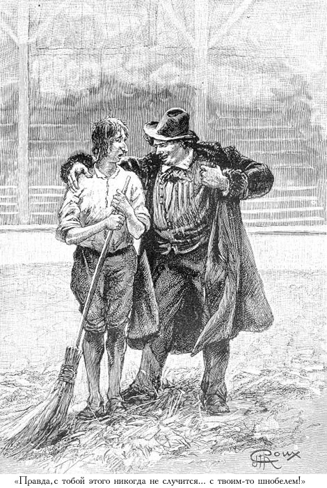 Пьеса началась в полной тишине. Какой хорошенькой выглядела Наполеона в слегка поношенной полосатой юбочке, в милом чепчике, подобно цветку, украшавшему ее белокурую головку! Но главное — ее невинная и нежная внешность! Первый любовник Сандр в оранжевом камзоле, полинявшем под мышками, ухаживал за ней с помощью столь страстных жестов, что и слова не сделали бы их диалог более доходчивым! Им помешал Клу в дурацком ярко-желтом парике, с немыслимыми окулярами на носу, на длинных нескладных ногах, которые он переставлял как ходули! Гримасничавшая обезьянка и болтливый попугай остроумно передразнивали его! Невозможно представить себе что-либо уморительнее этой шутовской феерии!