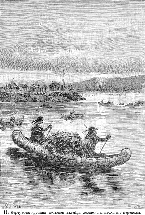 Эту сеть водных дорог бороздят вверх и вниз небольшие лодки, в основном — «байдары», что-то вроде пирог из шкур, швы между которыми смазываются жиром, чтобы они не пропускали воду. На борту этих хрупких челноков индейцы отваживаются делать значительные переходы, не стесняясь, впрочем, взваливать их на плечи, обходя какой-нибудь порог или завал.