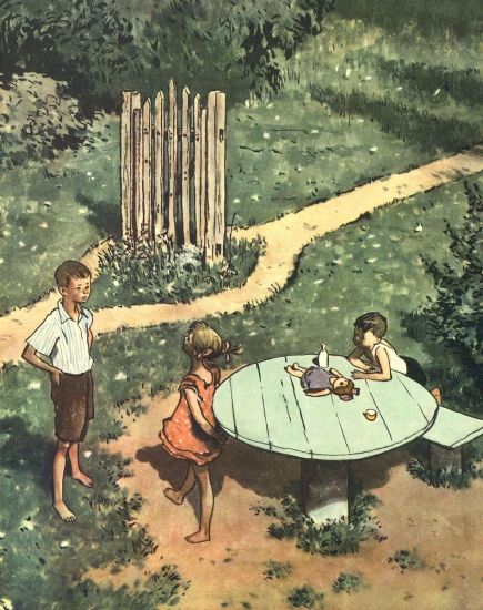Дима выбежал на лужайку и у стола увидел своего младшего братишку Вовку и хозяйскую дочку Марусю. Маруся растирала кукле Дуньке живот, а Вовка лил в куклин рот лекарство. Это они играли в папу-маму.