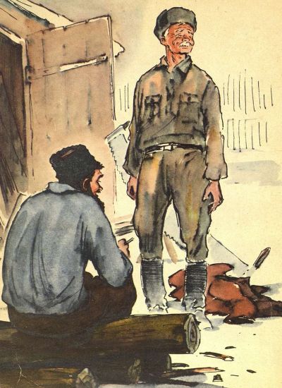 — Ну ладно, — соглашается чёрный и, поправив на голове шапку, хватается за пилу своими ручищами.