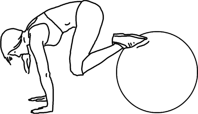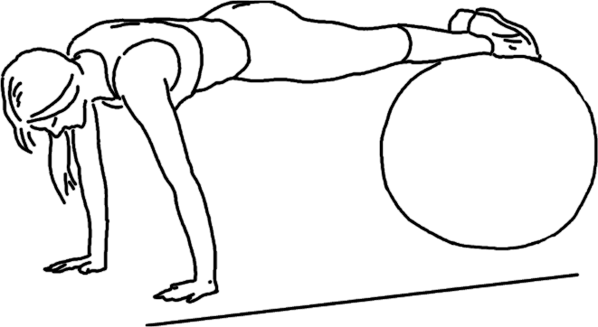 Положите ноги на мяч. Пройдите руками по полу вперед, пока мяч не окажется под лодыжками. Ладони должны быть точно под плечами. Следите за тем, чтобы корпус был параллелен полу, не опускайте таз вниз, напрягите мышцы пресса. Сделайте вдох, на выдохе согните колени и притяните их к груди. На вдохе снова выпрямите ноги и откатите мяч обратно (рис. 26).