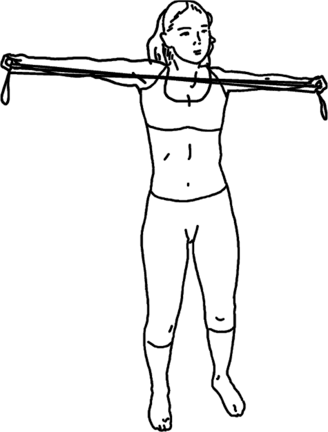 Встаньте прямо, ноги на ширине плеч, руки перед грудью. Поднимите локти на высоту плеч.
