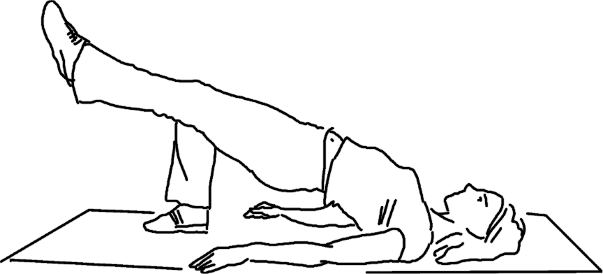 Ягодицы при этом нужно все время держать в напряженном состоянии и не опускать таз при разгибании ноги. На вдохе опустите сначала ногу и только затем опуститесь полностью. То же самое проделайте правой ногой. Сделайте это упражнение по 10–15 раз на каждую ногу.