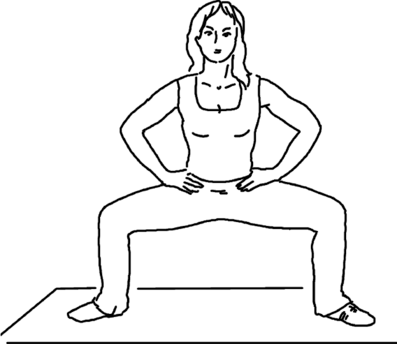 Исходное положение – стоя, ноги шире плеч. Разверните носки наружу под углом 45 градусов, руки положите на талию. На вдохе выполните приседание так, чтобы колени направлялись по одной линии со стопами. Бедро должно быть параллельно полу, а угол в коленном суставе – прямой. Если угол в колене получается острый, то в исходном положении поставьте ноги немного шире.