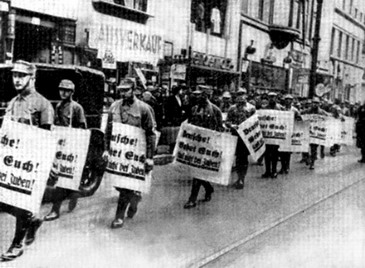 Рис. 30. Шествие штурмовиков 1 апреля 1933 года, на плакатах надписи: «Немцы! Сопротивляйтесь! Не покупайте у евреев!»