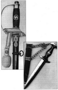 Кинжал в черных ножнах с широким заостренным лезвием и надписью готическим шрифтом «Моя честь – это верность» («Meine Ehre heisst Treue») являлся символом эсэсовской элиты. Он предназначался лишь для тех, кто имел чин не ниже оберштурмфюрера. В основу дизайна был положен так называемый Гольбейновский кинжал, который получил название по рисунку на ножнах, воспроизводившему сцены с полотна «Пляска смерти». Накануне войны в дополнение к ножу появился меч – на этот раз основой послужило холодное оружие немецких полицейских: изящный прямой клинок и прямая деревянная рукоятка, украшенная рунами победы.