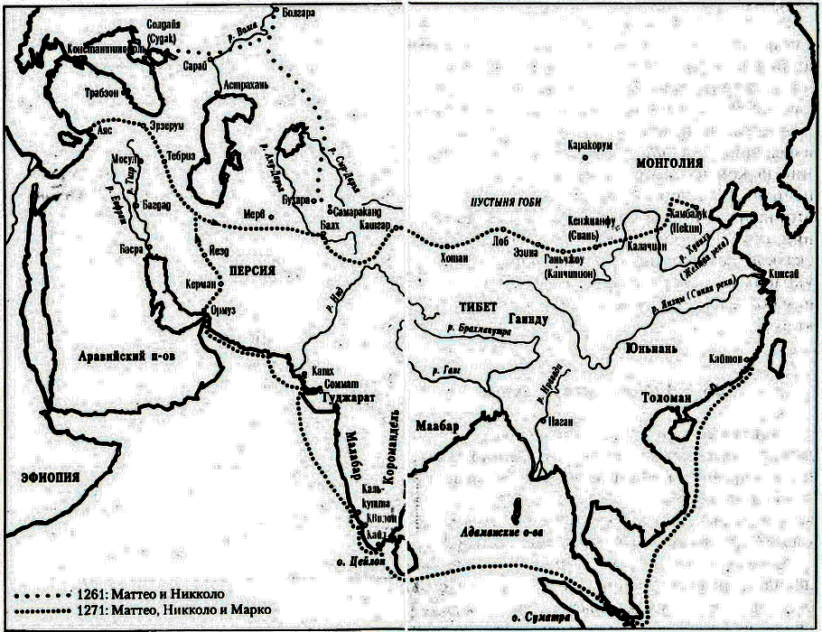 В 1261 году, как и десять лет спустя, наши венецианцы, без сомнения, путешествуют не как простые негоцианты, смешавшиеся с одним из сотен караванов, преодолевающих песчаные барханы и исследующих новые пути на Востоке. Они путешествуют как люди, посланные с определенной миссией, маленькой группой, состоящей из нескольких всадников — это обеспечивает определенные преимущества и большую безопасность. Это были заранее подготовленные и обдуманные переходы.