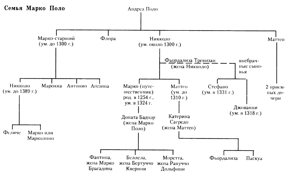С этого времени существует некоторый риск спутать членов семьи: дядей, племянников и даже кузенов, получивших одно и то же имя при крещении. Но, тем не менее, мы проследим биографию всего семейства не с абсолютной точностью, но достаточно подробно для того, чтобы связать путешествие в Китай с семейными отношениями и родом занятий каждого из Поло. Заодно проясним вопрос о семейных дрязгах вокруг наследства. Мы можем проследить судьбу семьи и оценить ее расцвет, гораздо более скромный вопреки легенде.