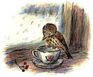 На подоконнике спит мышка Наморщенный Нос и птенчик дрозда Пимнен, а в сапоге Дедушки Храпа прячется Метла — это горностай.