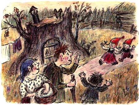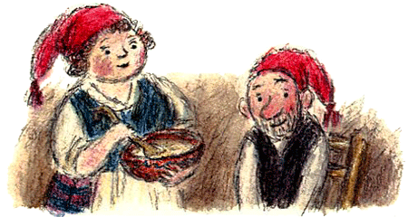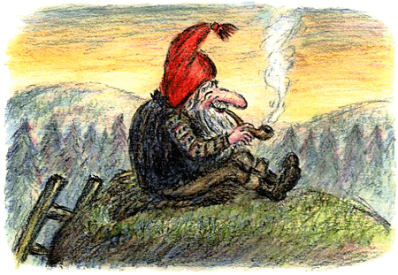 Пока Гури-Малла и Малютка Ульв размазывают по щекам воду, делая вид, что умываются, с чердака спускается старший из детей-гномов Петтер Смышлёныш, а из-под одеяла у камина выбирается Бабушка-старушка. Только Сювер-Соня никак не может проснуться — ему всегда тяжело вставать по утрам.