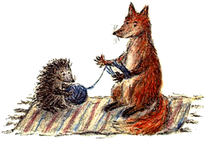 На шатком столике лежит корзинка с пряжей из шерсти Пройдохи Лиса — её подарил Бабушке-старушке сам Лис, когда линял. А спицы ей дал Ёжик, с которым она дружит. Ты уже, наверное, догадался, что спицы — это Ёжиковы иголки? Когда Бабушка-старушка не вяжет, она использует их как зубочистки.