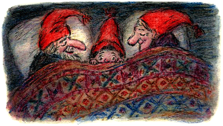 Зато Малютка Ульв не выдержал напряжения, соскочил с коленей Папы, молнией пронёсся по полу и юркнул под перину Бабушки-старушки и Дедушки Храпа и даже носа наружу не показывал.