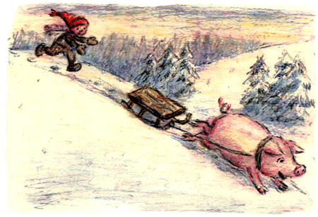 Сювер кидал и кидал шишки, пока человек не разозлился и не пошёл посмотреть, откуда они летят. Тут храбрый ниссе метнулся к санкам, отвязал поросёнка, и они вдвоём что есть мочи припустили домой, в гору.