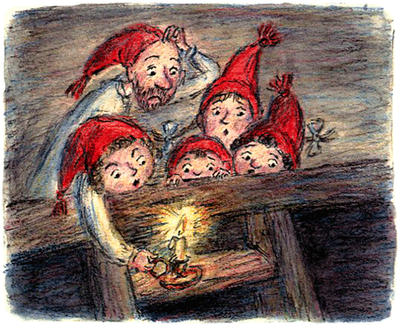 Ниссе на чердаке тут же проснулись. Папа поправил свой колпачок, Мама зажгла свечку, Гури-Малла и Малютка Ульв вылезли из-под перин.