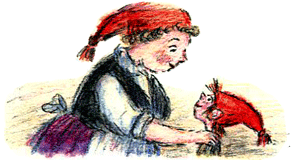 Но тут Мама Ниссе вскочила на ноги, подбежала к сундуку и достала оттуда красный колпачок. Она подошла к Кривуле и натянула колпачок на непослушные огненные вихры троллика, обняла его и сказала, утирая со щёчек-яблочек громадные слёзы: