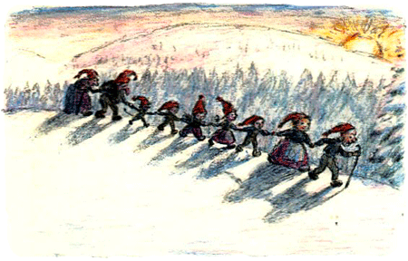 На следующее утро в лес отправилась процессия из девяти ниссе. Шёл снег, и идти было очень трудно. Особенно двум старикам.