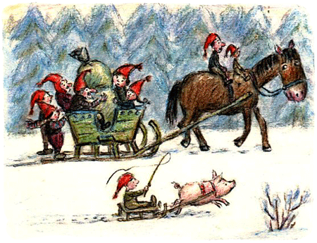 На следующий день в лес опять направилась процессия из девяти ниссе. А впереди них Гордец вёз нагруженные рождественскими подарками сани. Гномы шли к Рождественскому ниссе.