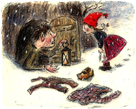 Гури-Малла осторожно сделала ещё несколько шажков вперёд. И тут ей навстречу вылетело ЧТО-ТО и шлёпнулось на снег прямо у неё под носом. Гури-Малла наклонилась и увидела, что это штаны Фюкомфея. Не успела девочка распрямиться, как из-под пня вылетело ещё ЧТО-ТО и тоже шлёпнулось на землю. Это оказалась рубашка отца троллика: на ней всегда не хватало пуговиц.
