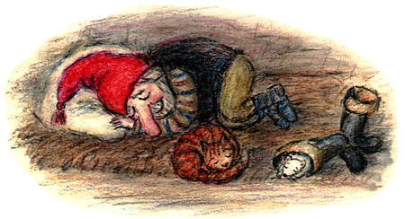 Дедушка Храп решил рассказать внукам вечернюю сказку, но малыши слушали его невнимательно. Они всё время оглядывались на флейты. В этот вечер в постель ложились грустные и разочарованные ниссе. Впервые целый день работы прошёл впустую! Тем более перед Рождеством! Все тихо пожелали друг другу «Спокойной ночи!» и натянули одеяла по самые уши — наружу выглядывали только кисточки красных колпачков.