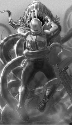 Шевелящаяся "масса тех же самых коричневых щупалец. Выдавшаяся вперёд крокодило-акулья пасть. Два пучка зелёных глаз по обе стороны челюстей. Внизу – что-то вроде «подошвы», как у улиток или слизней. Тварей этих было там самое меньшее с десяток, гараж был битком набит, и Кеос, разогнавшийся быстрее остальных, с разгону влетел прямо в ждущие объятия.
