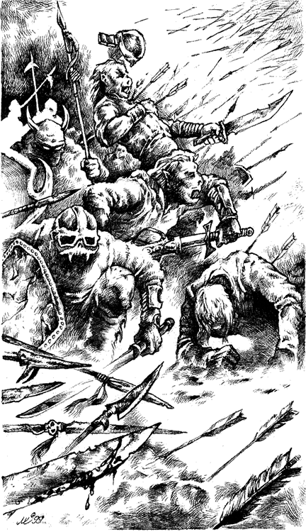 Деревянные бляхи на доспехах, наверное, неплохо помогали против легких тростниковых стрел, какими пользовались гоблины во время междуусобиц, но тяжелые длинные древки с четырехгранными закаленными оголовками, выпущенные из людских луков, пробивали броню гоблинов навылет, раскалывая нашитые на кожу кругляши.