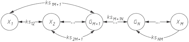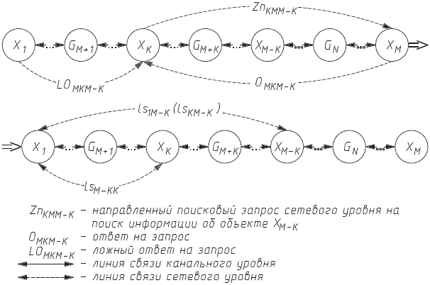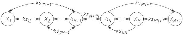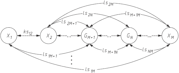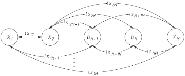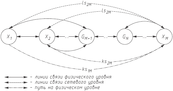 Пусть объект X2 взаимодействует с объектом XM. На графе это взаимодействие на сетевом уровне показано двунаправленным ребром ls2M, которое располагается между вершинами X2 и XM. Соответственно на канальном уровне путь между объектами X2 и XM проходит через вершиныGM+1 … GN.