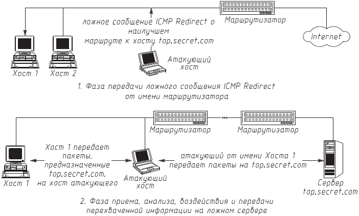 В первом случае кракер находится в том же сегменте сети, что и объект атаки. Тогда, послав ложное ICMP-сообщение, он в качестве IP-адреса нового маршрутизатора может указать свой IP-адрес или любой из адресов данной подсети. Это даст атакующему возможность перемаршрутизировать сообщения, направляемые атакованным хостом на определенный IP-адрес, и получить контроль над трафиком между этим хостом и интересующим взломщика сервером. Далее атака перейдет во вторую стадию, связанную с приемом, анализом и передачей пакетов, получаемых от «обманутого» хоста. Рассмотрим функциональную схему осуществления этой атаки (рис. 4.11):