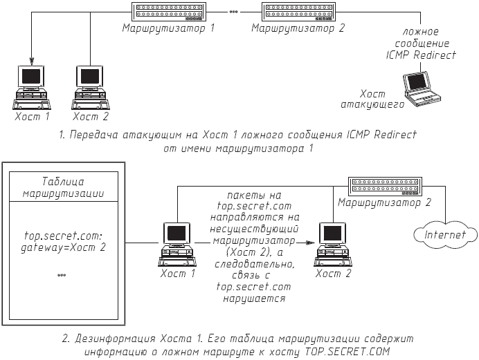 Исследование публикаций, посвященных протоколу ICMP, показало, что сообщение Redirect Datagrams for the Network устарело и уже не используется современными сетевыми ОС. Это подтверждает и проведенный авторами анализ исходных текстов ОС Linux 1.2.8. Иначе дело обстоит с управляющим сообщением Redirect Datagrams for the Host: здесь нет такого единства в рядах разработчиков различных сетевых ОС. Наши исследования показали, что на практике многие из известных UNIX-систем игнорируют это сообщение. Например, если в версии Linux 1.2.8 еще была реакция на Redirect Datagrams for the Host, то уже в версии Linux 2.0.0 такое сообщение игнорировалось. Иначе обстоит дело с ОС фирмы Microsoft – Windows 95 и Windows NT. Опасность Redirect Datagrams for the Host не была принята во внимание, и обе системы реагируют на это сообщение, позволяя удаленно изменять таблицу маршрутизации на любом Windows-хосте.