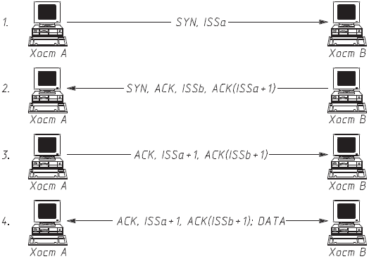 Предположим, что хосту А необходимо создать TCP-соединение с хостом В. Тогда А посылает на В следующее сообщение: SYN, ISSa.