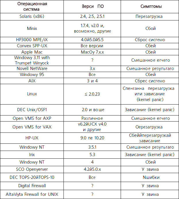 Итак, 18 декабря 1996 года на информационном сервере CERT появились сообщения о том, что большинство сетевых операционных систем, поддерживающих протоколы TCP/IP, обладают следующей уязвимостью: при передаче на них IP-пакета длиной, превышающей максимально допустимое значение, в этих ОС переполняется буфер или переменная, в результате система «зависает» или перезагружается, то есть налицо отказв обслуживании. Был приведен и список потенциально опасных платформ: