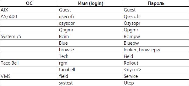 Таблица 9.1. Примеры имен и паролей по умолчанию в различных ОС
