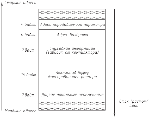 Рассмотрим его. Весьма часто в процедурах программист отводит для своих нужд некоторый локальный буфер, имеющий фиксированный размер. Этот размер обычно устанавливается исходя из здравого (или не очень здравого) смысла. Например, если читается строка с экрана, то программист может ограничить размер буфера 80 символами, имя файла на NTFS не должно содержать более 255 символов – именно такой буфер может быть отведен в этом случае и т. п.