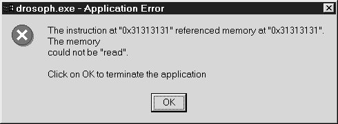 Не случайно в приведенных выше рассуждениях ни разу не встретилось упоминания о конкретной операционной системе. Действительно, технология переполнения локального буфера весьма универсальна и будет работать практически в любой ОС (об ограничениях чуть ниже), поэтому читатель может скомпилировать программу-дрозофилу в его любимой ОС и посмотреть на результат, подав на вход, скажем, строку из 30 единиц (этого должно быть достаточно для любой ОС и любого компилятора). UNIX-системы при этом выведут что-то типа «Segmentation fault, core dumped». Информация от Windows NT (рис. 9.2) для хакера более наглядна – по ней сразу понятно, что произошло именно переполнение буфера с возможностью подмены адреса возврата, так как адрес, на котором «споткнулась» программа, был не чем иным, как 0x31313131. Это соответствует шестнадцатеричному коду для строки из четырех единиц. Если ввести строку, состоящую из неодинаковых символов, например 01234567890abcdefghijklmnopqst, то по выведенному адресу станет ясно, в каком месте строки должен стоять будущий адрес возврата.