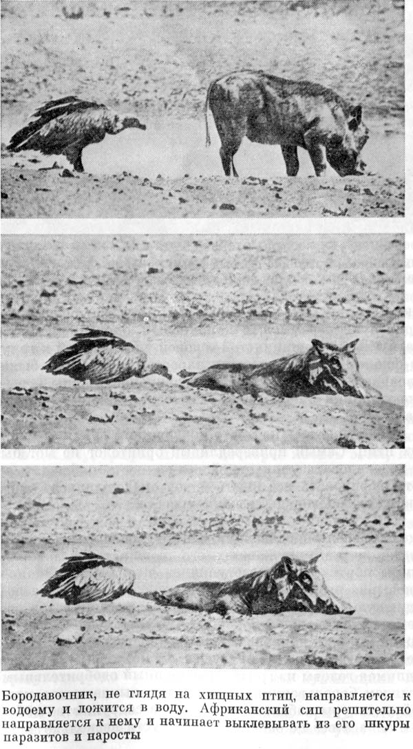 В довершение нашего торжества к водоему важно прошествовал бородавочник, не обращая ни малейшего внимания на окружавших его пожирателей падали. Птицы почтительно расступились перед ним. Лениво поковыряв рылом землю, кабан вошел в воду, едва доходившую ему до брюха, и спокойно растянулся в водоеме, напоминавшем большую лужу. Немедленно один рыжий хищник направился к нему, вытягивая длинную змеевидную шею. Кабан искоса посмотрел на него, не поднимая головы из грязи. Поощренный одобрительным взглядом бородавочника, сип начал выклевывать клещей из шкуры кабана. Трогательное содружество кабана и сипа вовсе не означает, что спустя несколько дней тот же сип не будет лакомиться остатками бородавочника, если злая судьба сделает последнего добычей льва или гепарда.