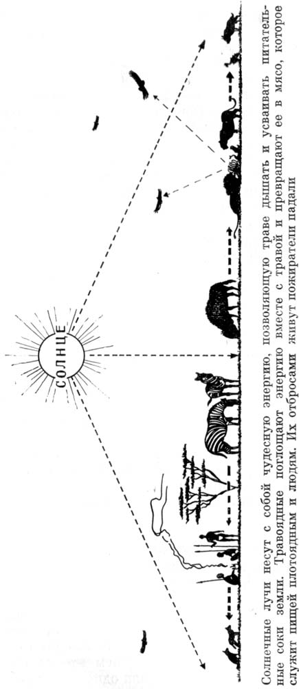 Проследим путь, который проходит энергия, приносимая на землю солнечным лучом. Она дает жизнь сочной траве, покрывающей равнину Серенгети. Трава дает газели Гранта пищу, а с ней передает и свою энергию. Леопард убивает газель и поддерживает свою жизнь ее мясом. Группа львов настигает леопарда вдали от прибрежных кустарников, умерщвляет его и кормится его плотыо. На стареющего льва набрасываются кровожадные гиены и, пожирая его мясо, восстанавливают свою энергию.