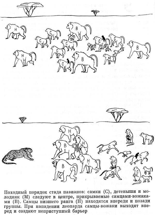 Из укрытия между двумя камнями мы спокойно наблюдали в бинокль за жизнью племени. Наше внимание привлекли несколько сильных крупных обезьян, которым густой воротник жестких волос, покрывавший спину и плечи и пышно разросшийся на щеках, придавал особенно внушительный вид. Они важно разгуливали среди своих менее представительных соплеменников, которые почтительно уступали им дорогу. Два великана лениво развалились на солнце, время от времени снисходительно поглядывая на самок, усердно искавших у них блох. Это привилегированные самцы-вожаки.