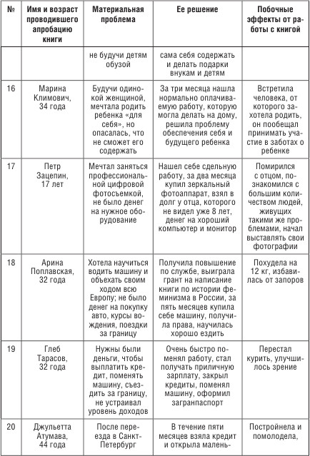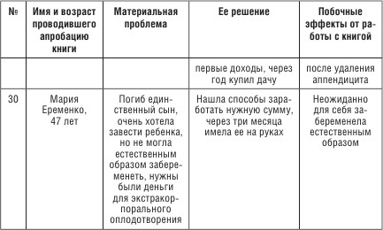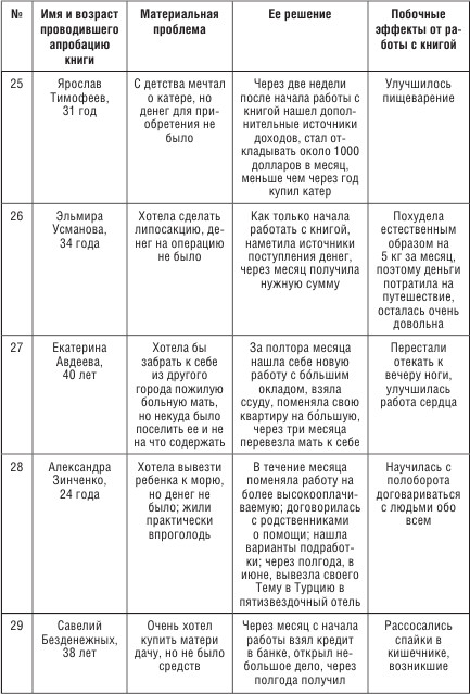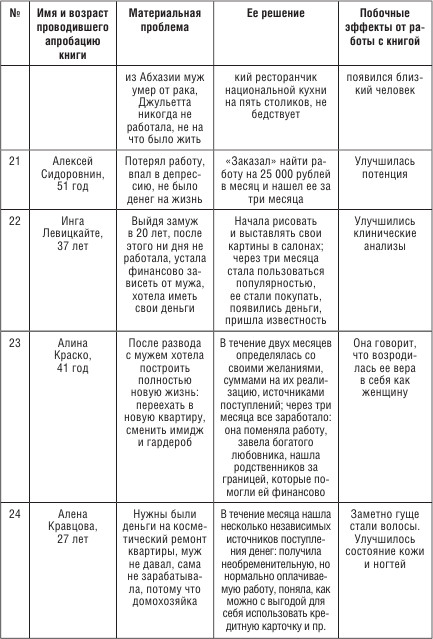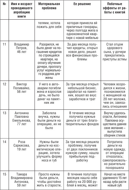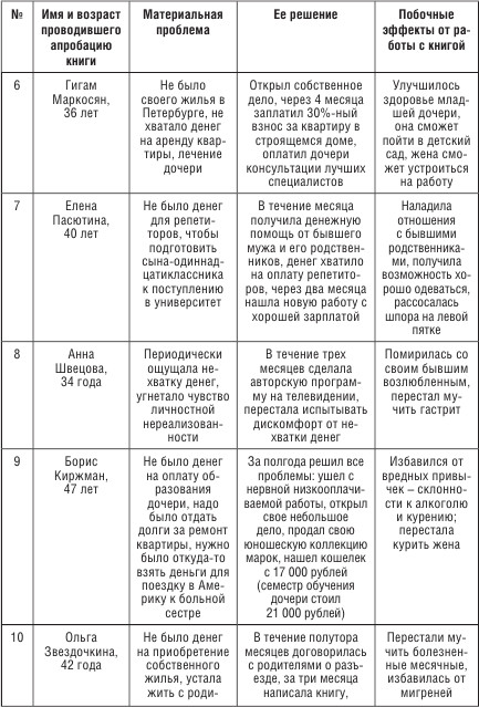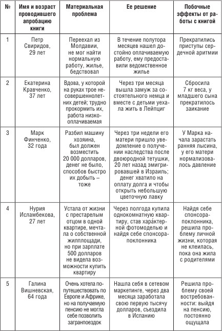 Итак, книга прошла успешную апробацию. Все подопечные Института Блаво, принявшие участие в эксперименте, испытали улучшения в своей материальной ситуации и в жизни в целом. Были решены проблемы, которые ранее казались принципиально нерешаемыми. Люди перестали ощущать себя в тупике. Они поверили в свои силы, настроившись на вибрации энергии денег, обрели стабильность и благополучие. Предлагаем вашему вниманию фрагмент таблицы, в которой сведены свидетельства позитивных изменений, произошедших в жизни подопечных Рушеля Блаво в течение апробации книги.