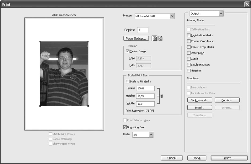 • Scaled Print Size (Измененные размеры печати). Настройки этой области позволяют увеличить или уменьшить изображение при печати: