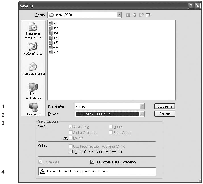 2. Выбор формата. В зависимости от выбора после нажатия кнопки Сохранить появляется дополнительное диалоговое окно, в котором нужно выбрать настройки. Об оптимизации файлов различных форматов написано в главе 4.