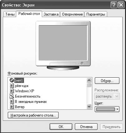 2. Вызываете окно настройки свойств экрана (Пуск → Настройка → Панель управления → Экран) и выбираете вкладку Рабочий стол (рис. 3.6).