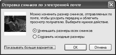 3. В Windows XP при этом появится сообщение с предложением уменьшить размеры изображения (рис. 3.8). Если вы провели оптимизацию, как описано в главе 4, то выберите действие Сохранить исходные размеры. Если же вы все-таки хотите сократить размер файла, рекомендуем установить переключатель в положение Показывать больше вариантов и выбрать разрешение, до которого следует уменьшить пересылаемое изображение. Имейте в виду, что уменьшенный файл пересылается быстрее, чем оригинал, но имеет худшее качество.