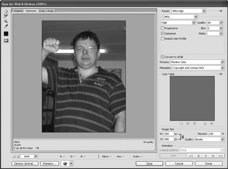 Справа внизу расположены области Color Table (Цветовая таблица) (активна для оптимизации GIF) и Image Size (Размер изображения), которая позволяет увеличить или уменьшить итоговое изображение. Для этого достаточно внести новые значения в поля W (Ширина) и H (Высота) или в поле Percent (Коэффициент изменения), а затем нажать кнопку Done (Готово).