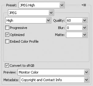 Правую верхнюю часть окна занимают настройки формата. Они различаются для JPEG и GIF. Список Preset (Заготовка) содержит набор настроек для самых распространенных ситуаций.
